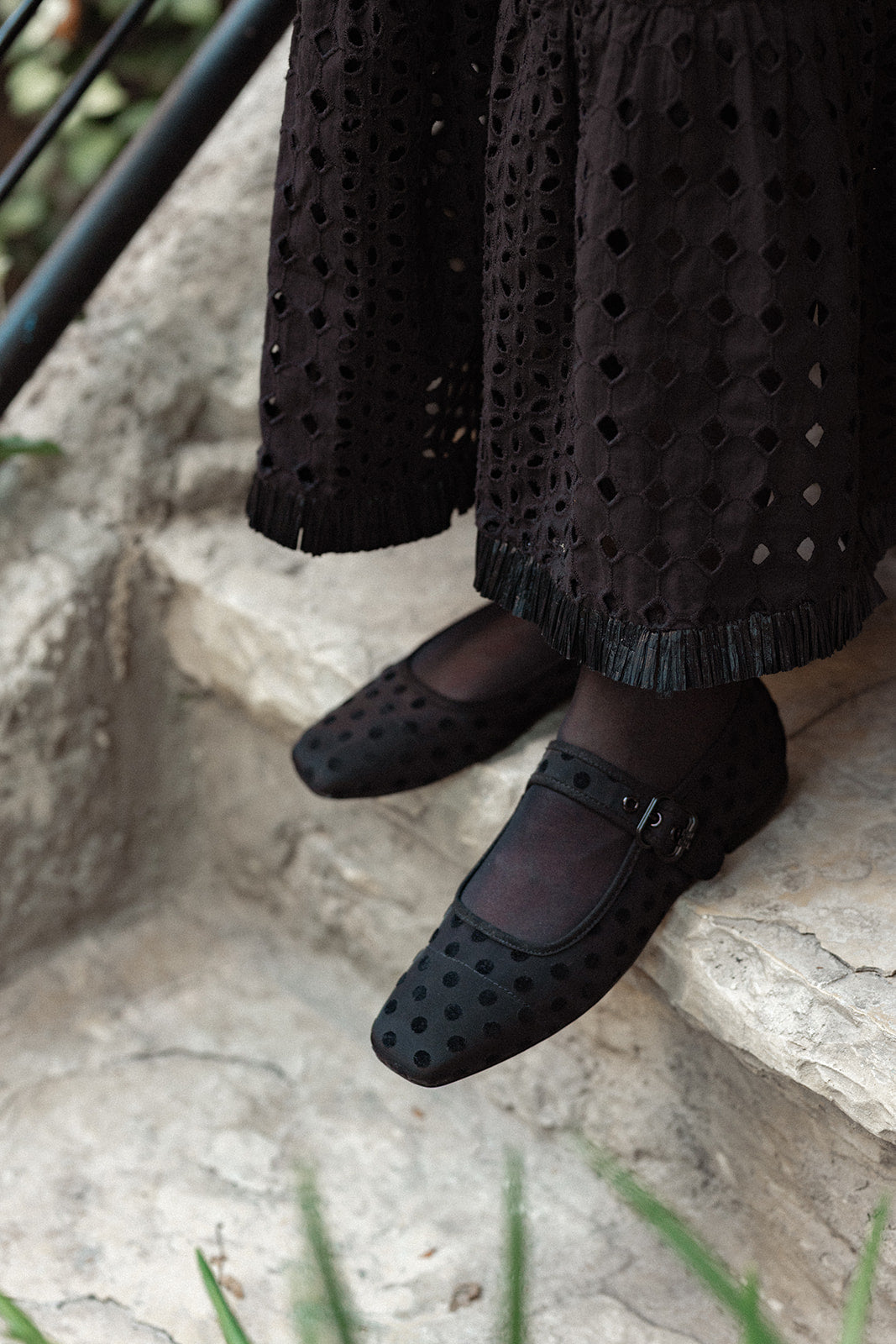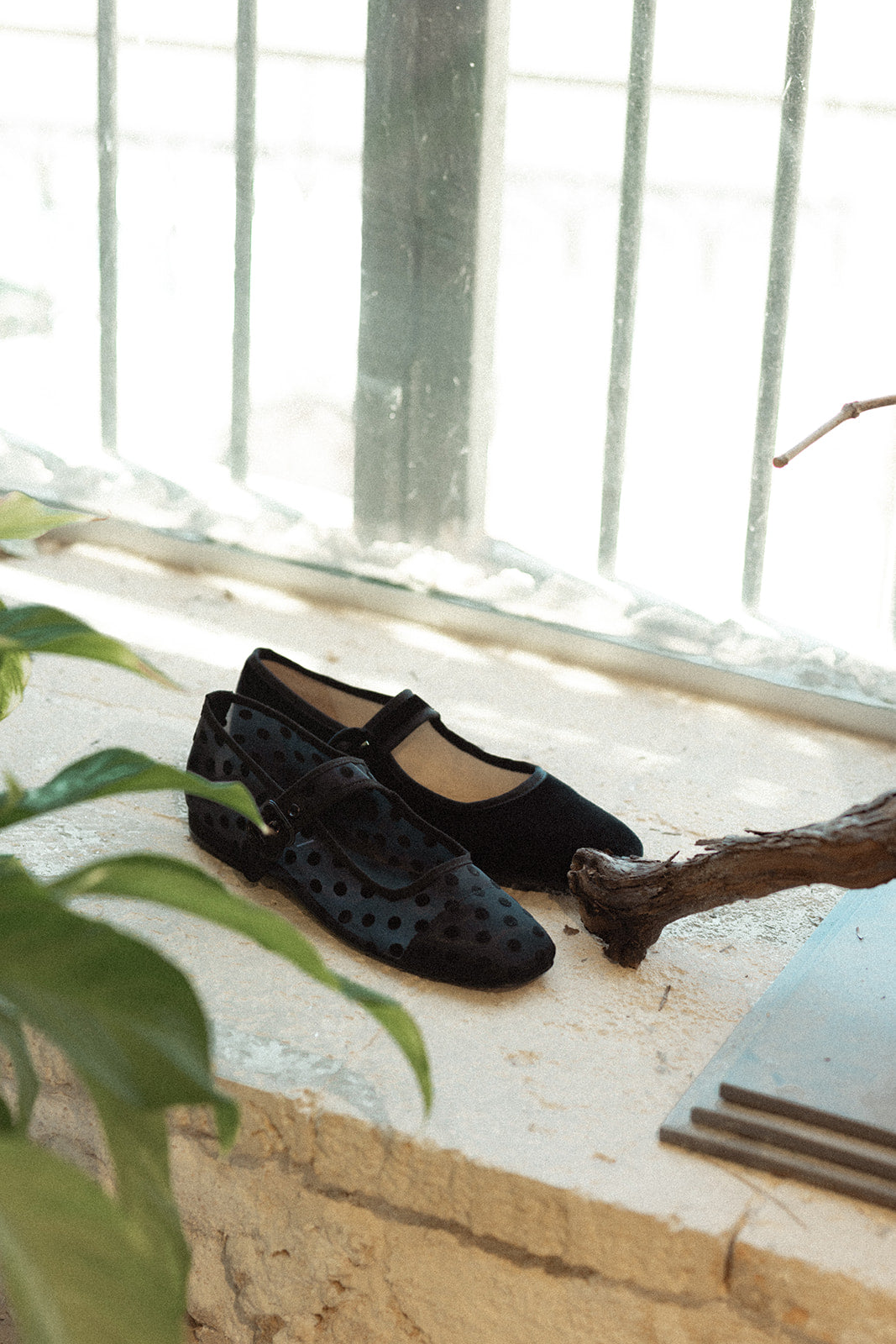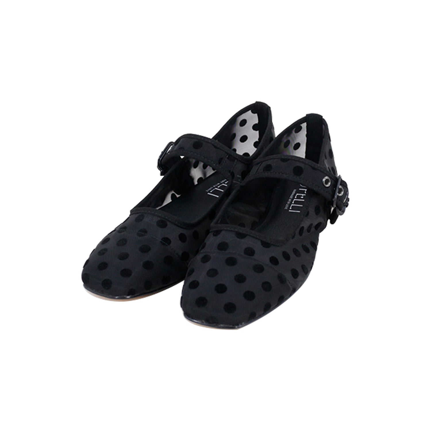 Trendy, youthful, and full of style.Crafted from mesh fabric dotted with velvet accents, these pointed shoes feature a sleek heel and a stylish buckle strap.Perfect for adding a modern and chic touch to any outfit.